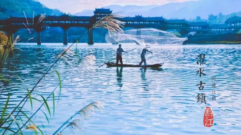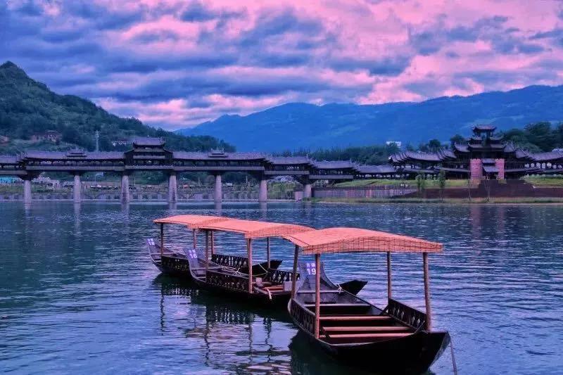 遠眺濯水,世界第一風雨廊橋橫臥江面,雄偉壯觀。遠處青山如黛,斜陽流水,江面的舟舸揚槳收槳之間,就已將這幅自然天成的山水畫卷勾織得和諧熨貼。