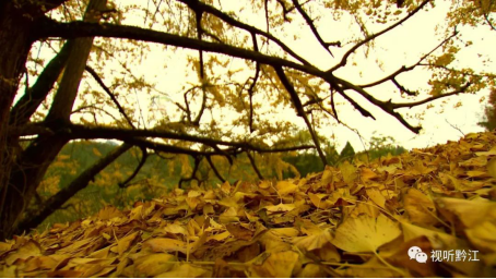 從高處俯瞰,黃紅相間的山林中,銀杏古樹最為顯眼。樹干上數不清的黃葉閃爍,如同披上了金色的外衣,色彩斑斕、美妙如畫。陣陣微風拂過,不斷掉落的葉片似金蝶翩翩起舞。