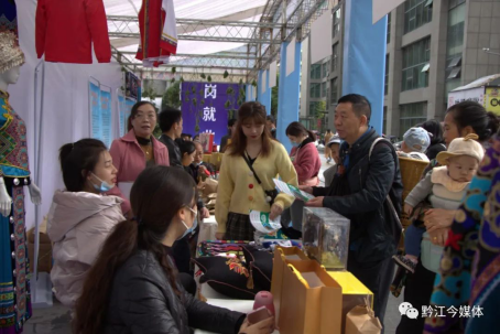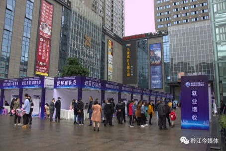 今天是周末,有著“黔江解放碑”之稱的大十字購物廣場人頭攢動,熱鬧非凡一場特殊的招聘會和展銷會在這里舉行。
