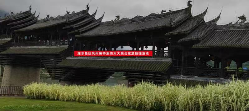 演練模擬濯水古鎮風雨廊橋木質建筑因廊橋垃圾桶內煙頭引發起火后,濯水景區立刻啟動應急預案。根據現場火勢,迅速組織多方力量進行撲滅。此次演練,檢驗了景區應急響應機制,火災處置、人員疏散救護等能力,提高了消防滅火應急應變能力和協同作戰能力,加深了員工對火災危險性的認識,進一步強化了其消防安全意識,確保濯水景區消防安全。