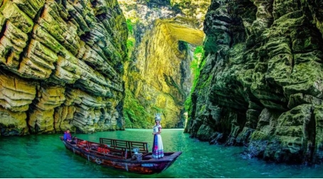 來暗河感受三天兩夜穿越之旅。一艘艘的游船躺在水面上,水綠得像是碧玉那般。